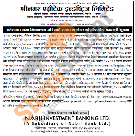 Shreenagar Agritech Industries Limited has allotted its 25,10,493 units IPO shares to the general public on 12th Kartik, 2082.