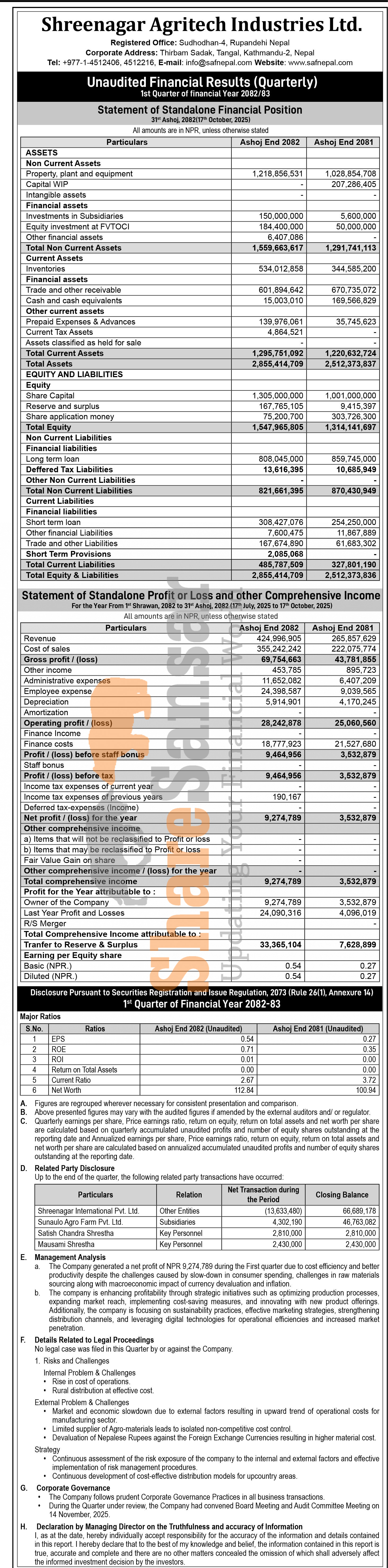 Shreenagar Agritech Industries Limited has posted a net profit of Rs 9.27 million and published its 1st quarter company analysis of the fiscal year 2082/83.