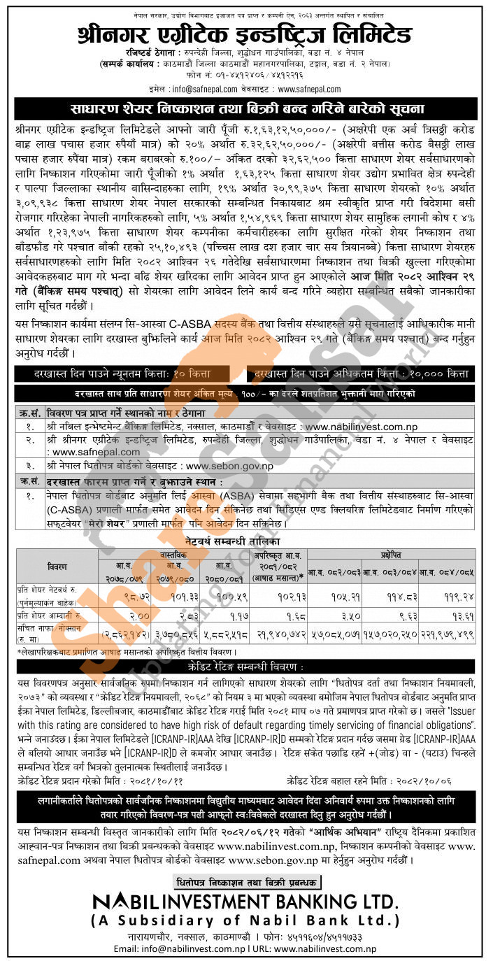 Shreenagar Agritech Industries Limited is closing its 25,10,493 units IPO shares to the general public from today (29th Ashwin, 2082).