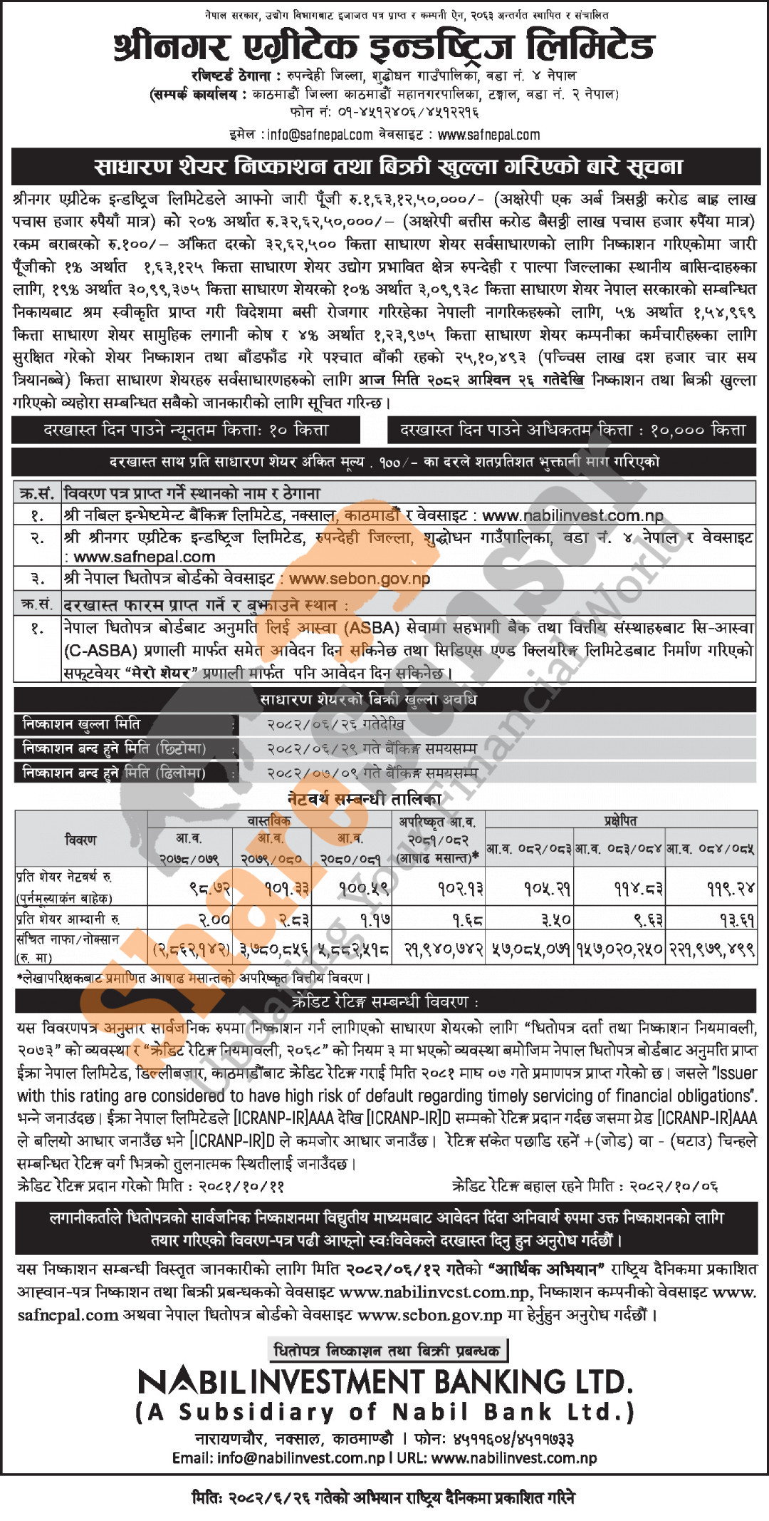 Shreenagar Agritech Industries Limited is opening its 25,10,493 units IPO shares to the the general public from today (26th Ashwin, 2082).