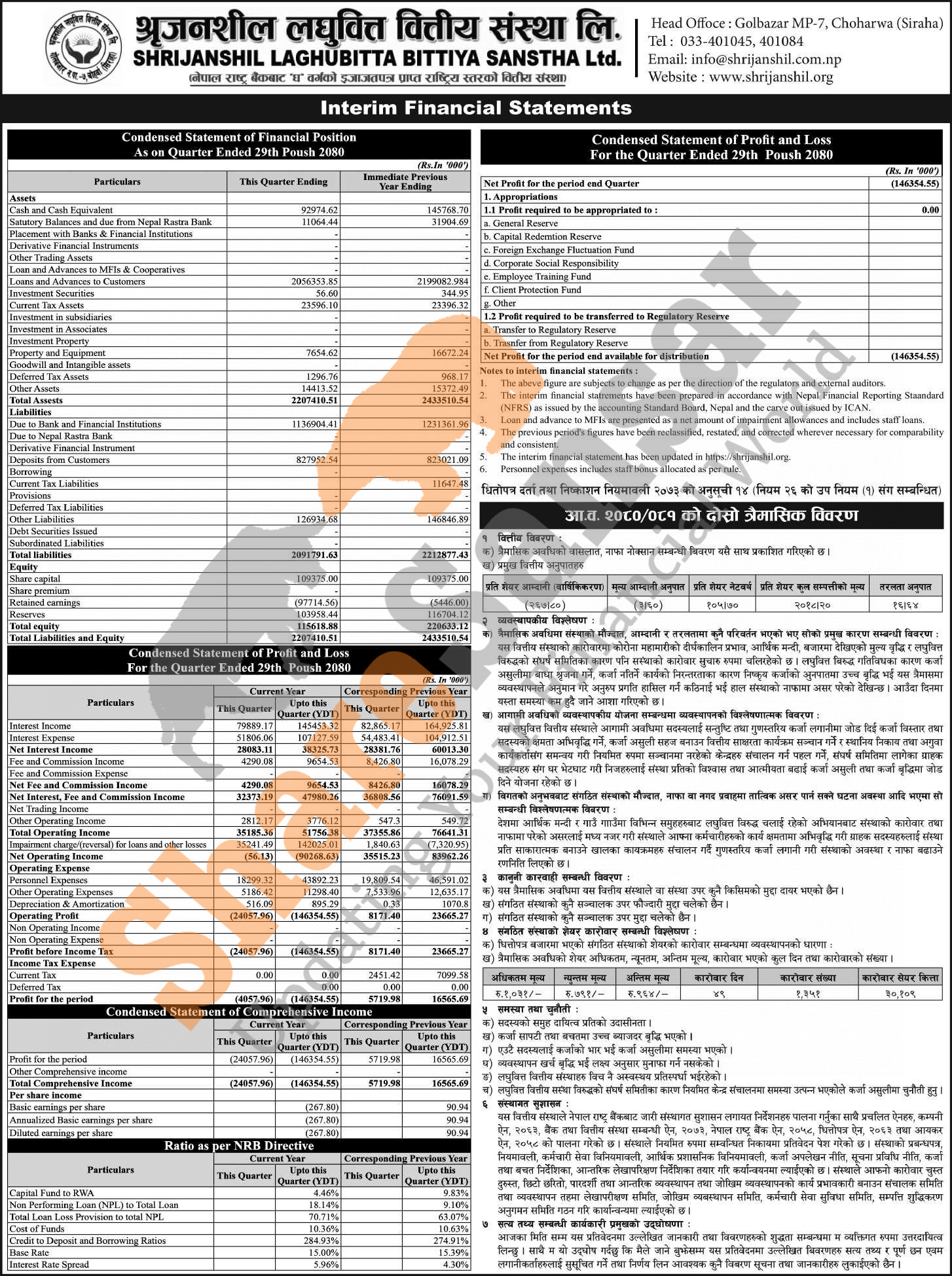 Shrijanshil Laghubitta Bittiya Sanstha Limited has posted a net loss of Rs 146.35 million and published its 2nd quarter company analysis of the fiscal year 2080/81.