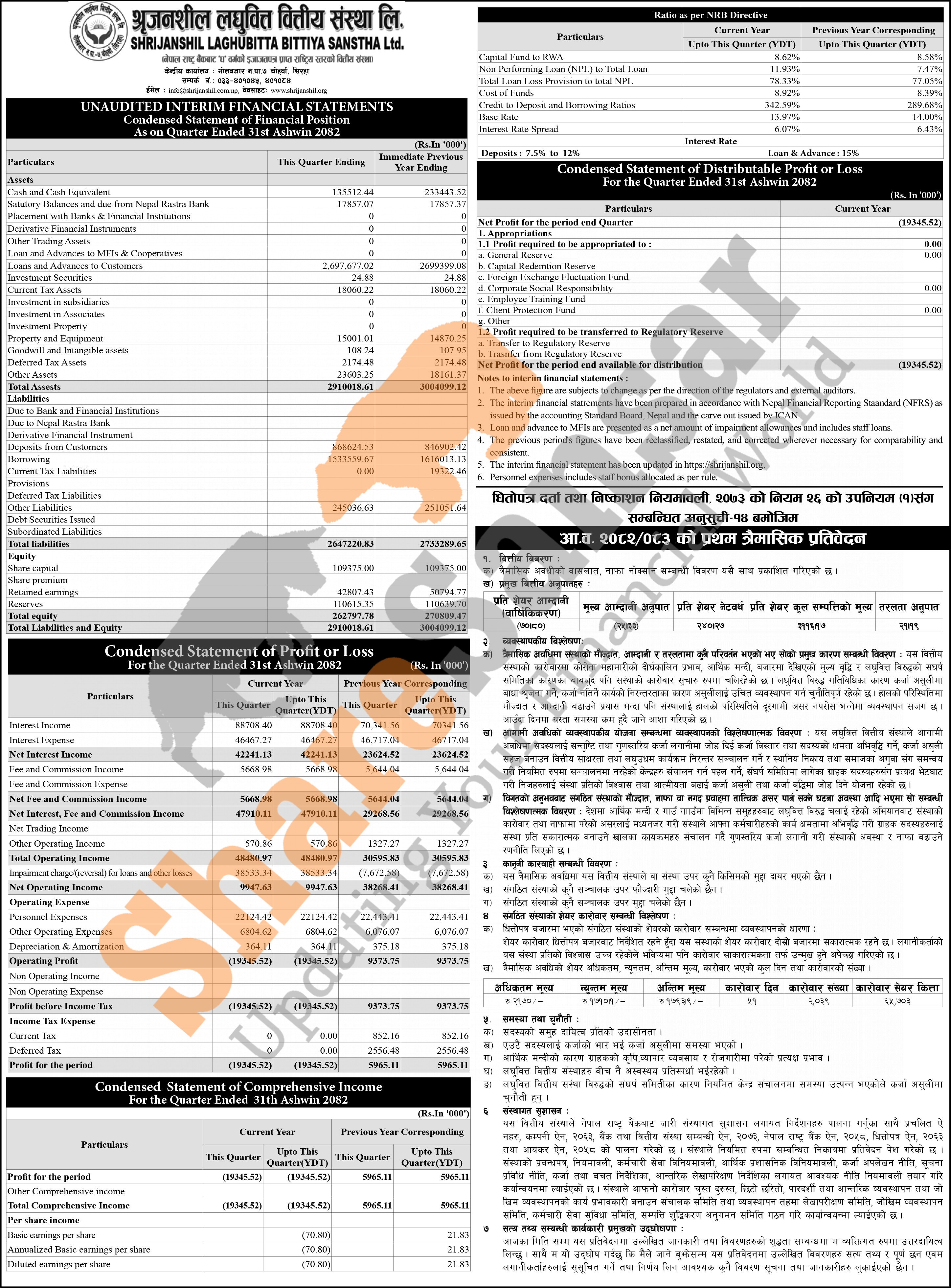 Shrijanshil Laghubitta Bittiya Sanstha Limited has posted a net loss of Rs 19.34 million and published its 1st quarter company analysis of the fiscal year 2082/83.