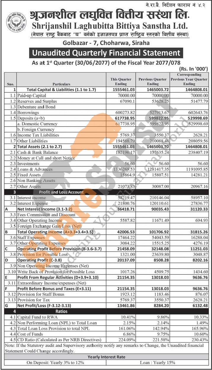 Shrijanshil Laghubitta Bittiya Sanstha Limited has posted a net profit of Rs 13.46 million during the 1st quarter of the fiscal year 2077/78.