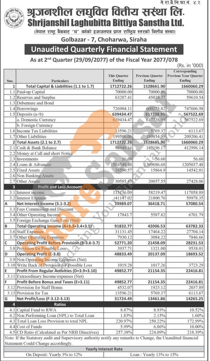 Shrijanshil Laghubitta Bittiya Sanstha Limited has posted a net profit of Rs 31.72 million and published its 2nd quarter company analysis of the fiscal year 2077/78.