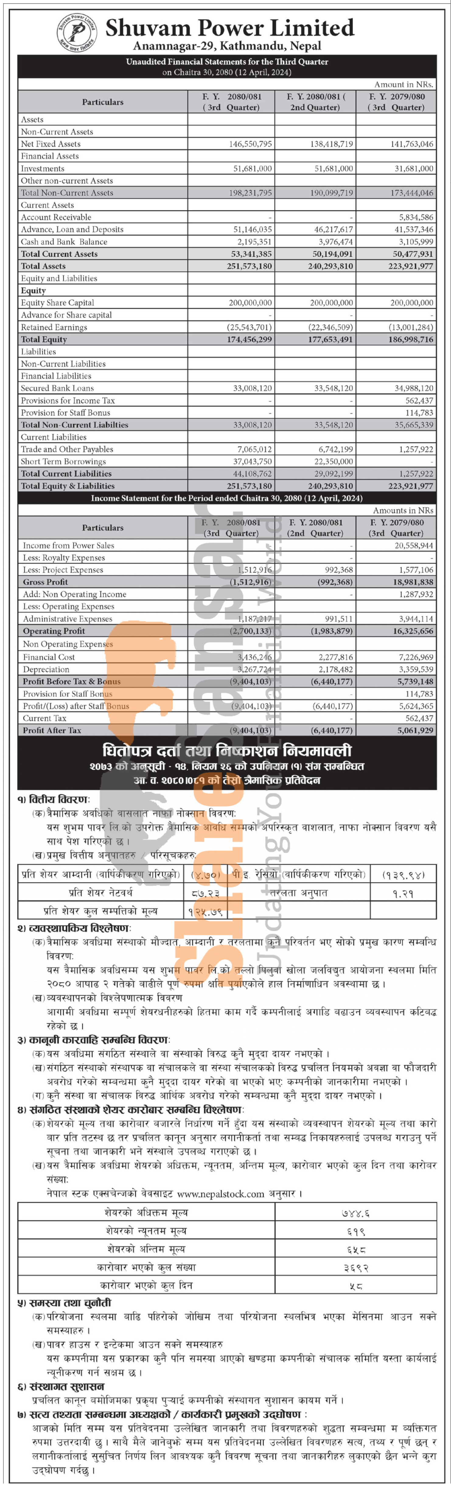 Shuvam Power Limited has posted a net loss of Rs 9.40 million and published its 3rd quarter company analysis of the fiscal year 2080/81.
