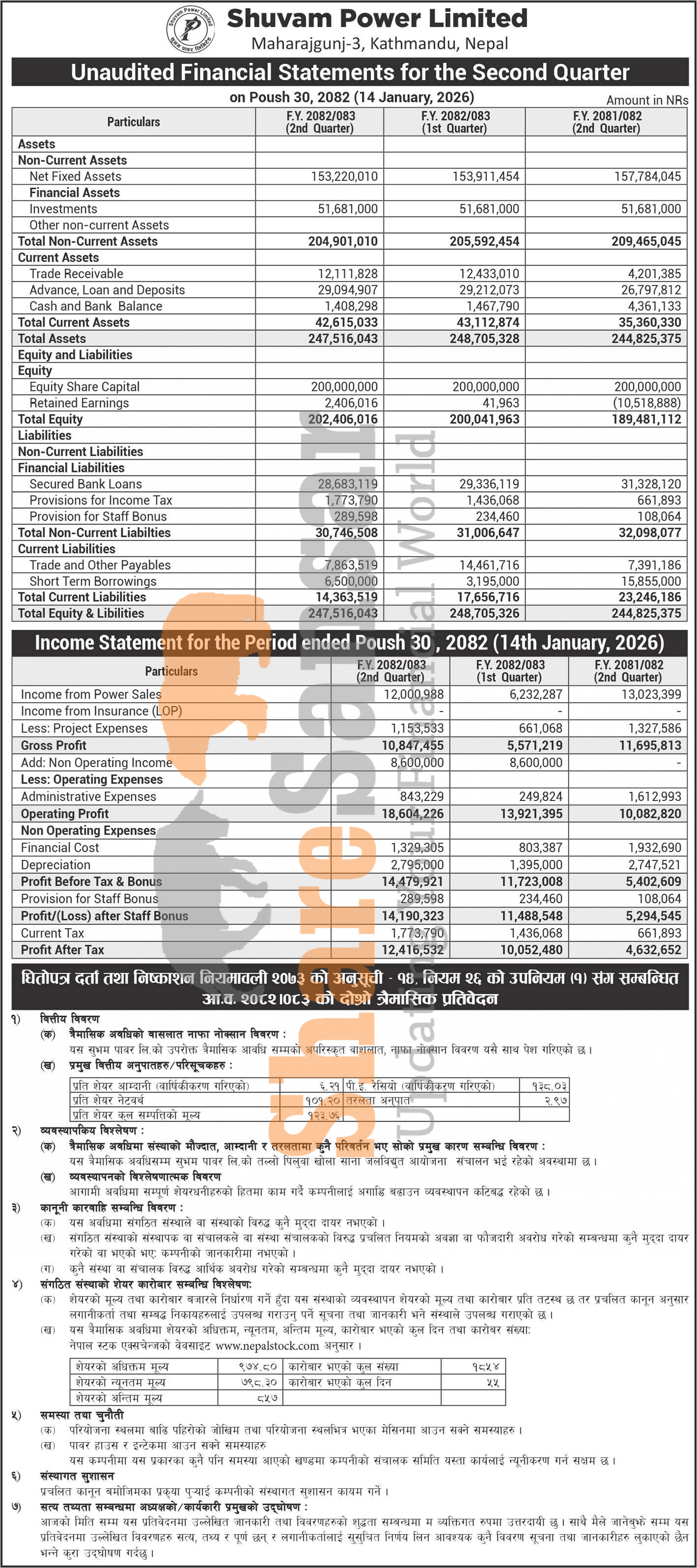 Shuvam Power Limited has posted a net profit of Rs 12.41 million and published its 2nd quarter company analysis of the fiscal year 2082/83.