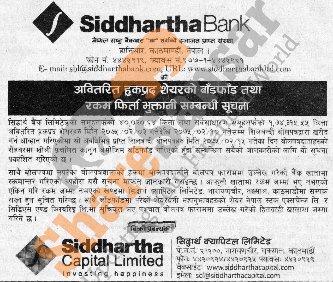 Siddhartha Bank Limited has allotted its 40,020.64 unit promoter shares and 1,74,315.55 units ordinary share in auction to general public on 15th Jestha, 2075 and refunding money to non-allottee investors.