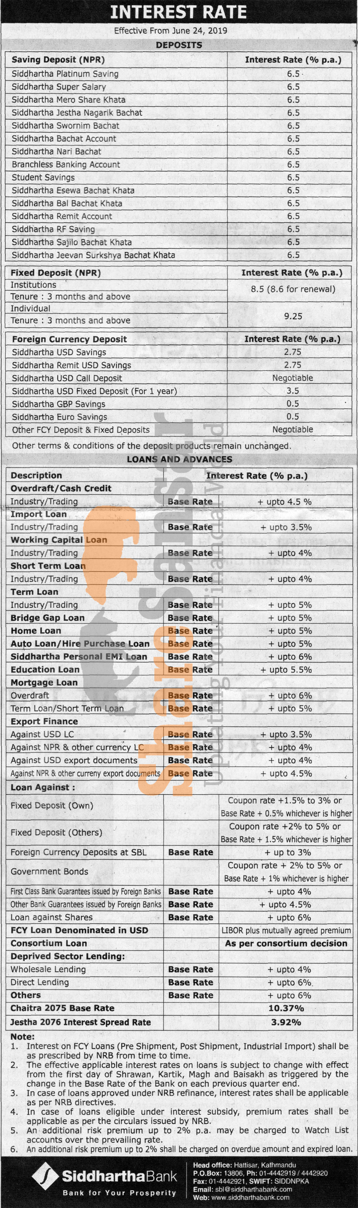 Siddhartha Bank Limited has published a notice regarding a new interest rate and its effective from 9th Ashad, 2076.