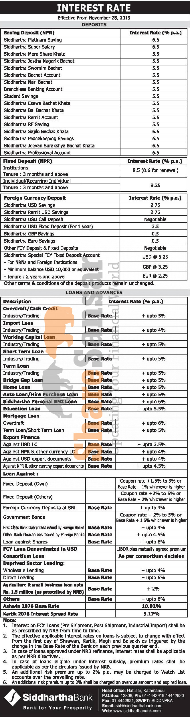 Siddhartha Bank Limited has published a notice regarding new interest rate and its effective from 12th Mangsir, 2076.