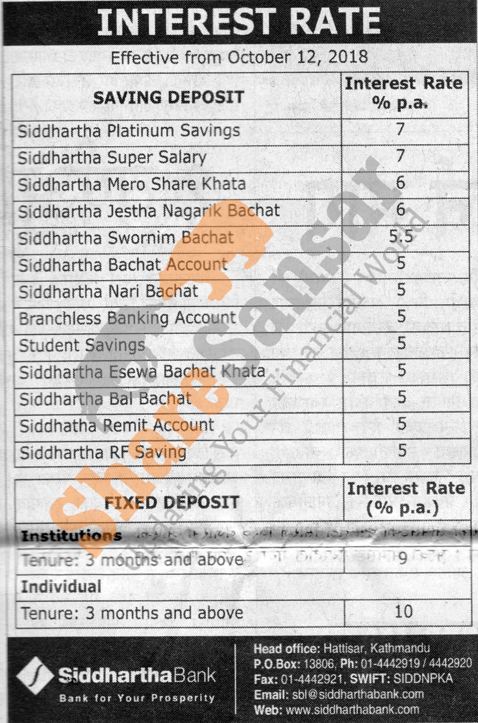 Siddhartha Bank Limited has published a notice regarding new interest rate and its effective from 26th Ashwin, 2075.