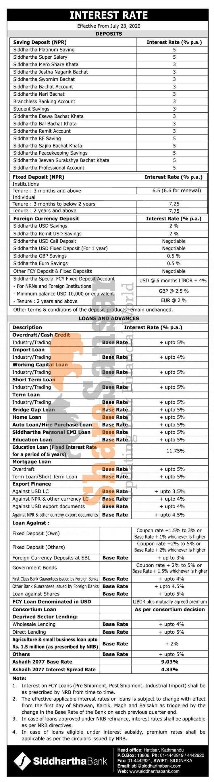 Siddhartha Bank Limited has published a notice regarding the interest rate on the various deposit and loan products and its effective from 8th Shrawan, 2077.