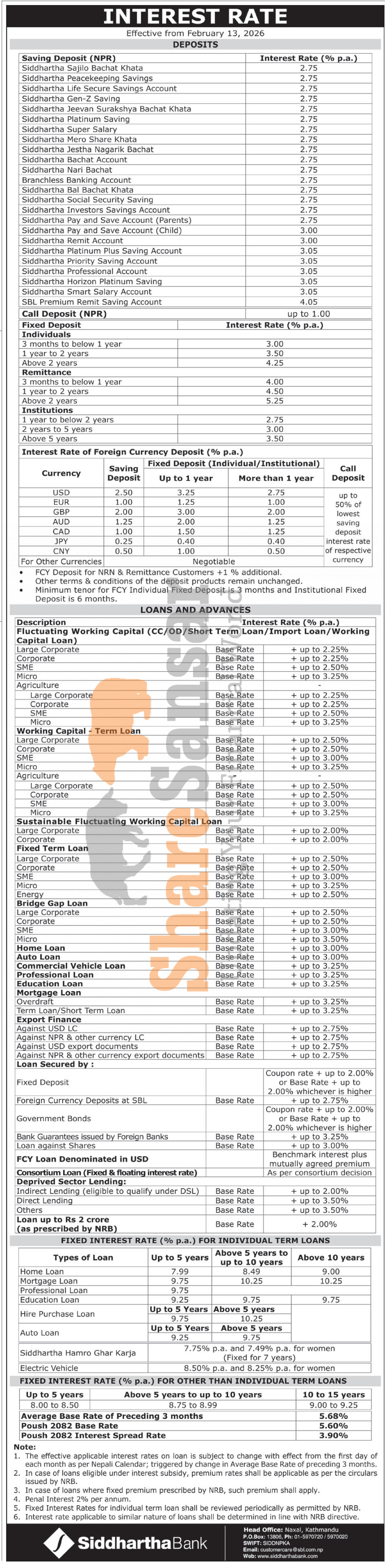 Siddhartha Bank Limited has published a notice regarding the new interest rate for deposit and loan products and it's effective from 1st Falgun, 2082.