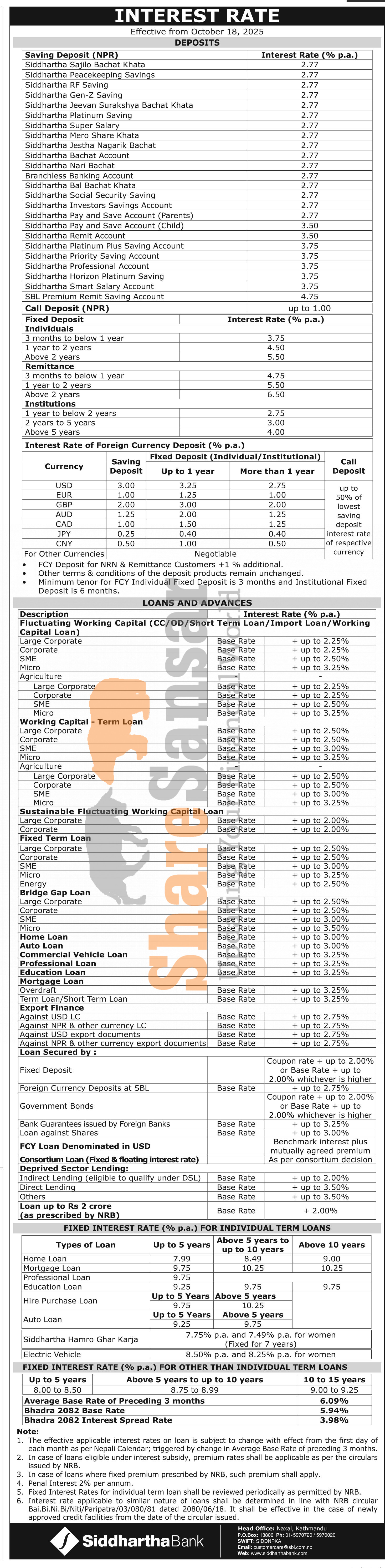 Siddhartha Bank Limited has published a notice regarding the new interest rate for deposit and loan products and it's effective from 1st Kartik, 2082.