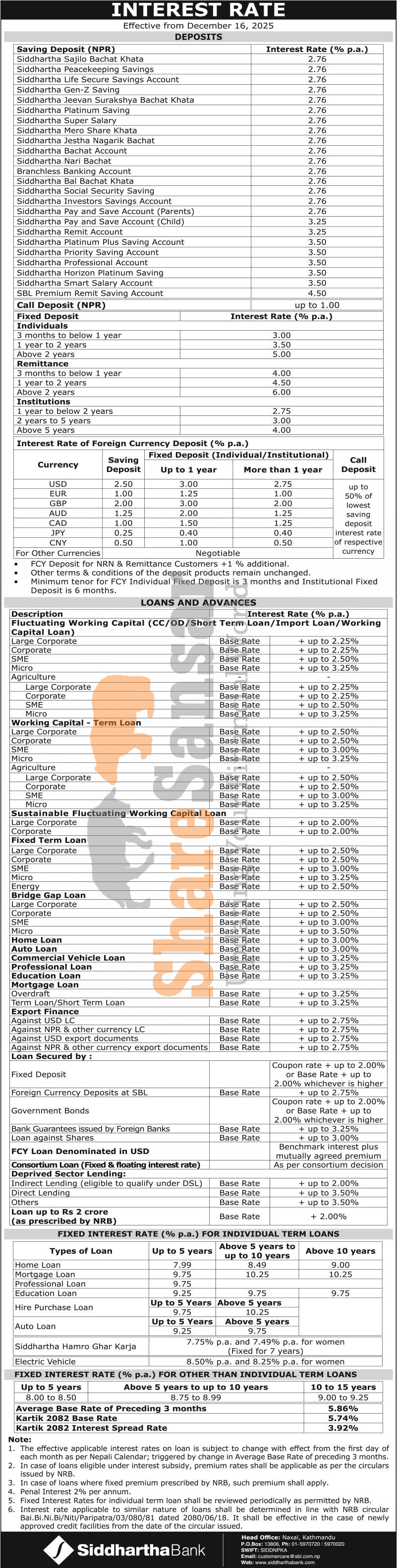Siddhartha Bank Limited has published a notice regarding the new interest rate for deposit and loan products and it's effective from 1st Poush, 2082.