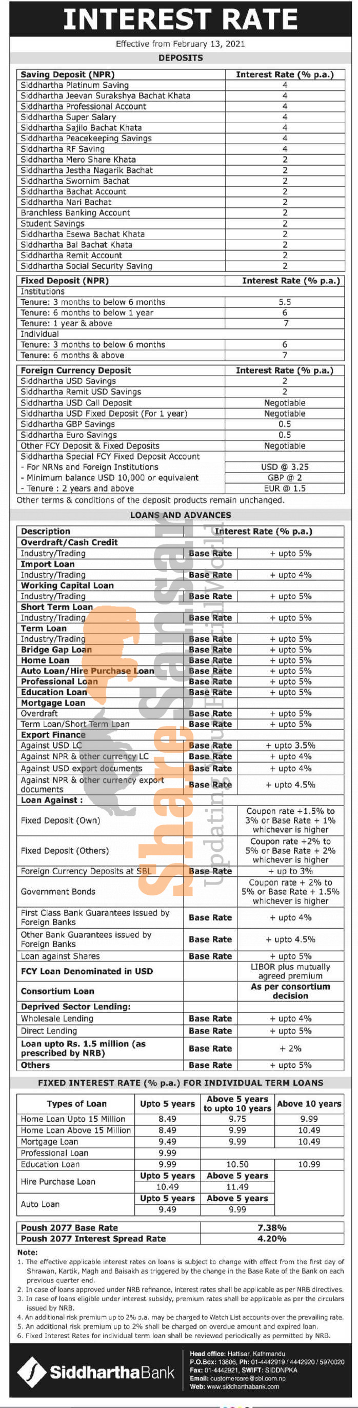 Siddhartha Bank Limited has published a notice regarding the new interest rate for deposit products and it's effective from 1st Falgun, 2077.