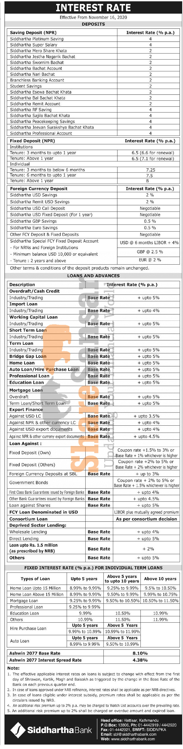 Siddhartha Bank Limited has published a notice regarding the new interest rate for its loan and deposit products and it's effective from 1st Mangsir, 2077.