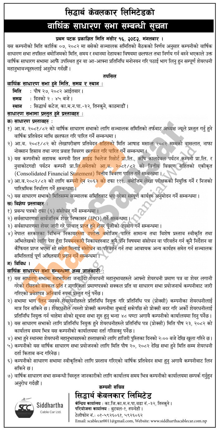 Siddhartha Cable Car Limited has announced its AGM going to be held on 27th Poush, 2082.
