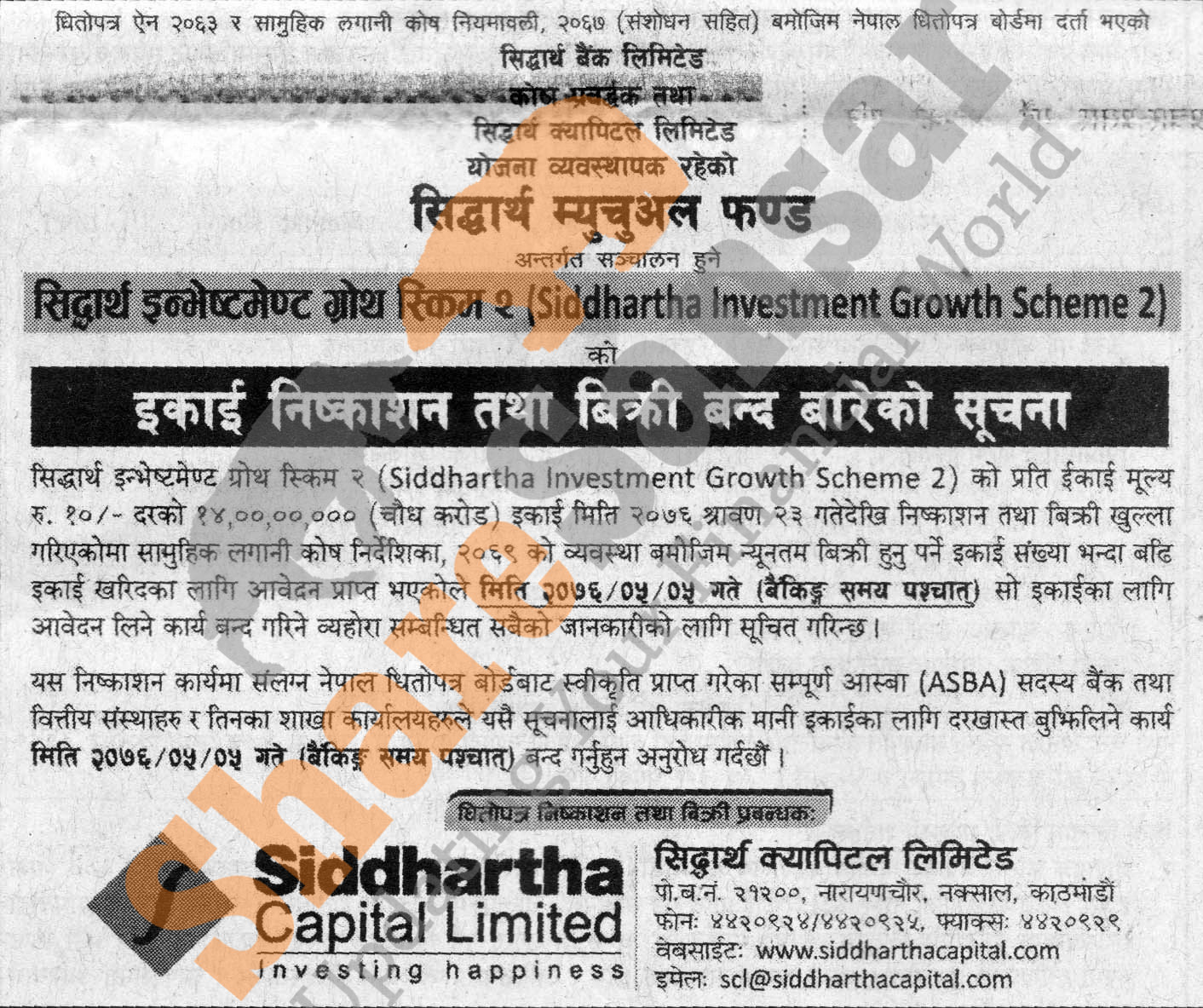 Siddhartha Capital Limited closing its 140 million units of Rs 10 face value each mutual fund scheme worth Rs 1.40 billion (Siddhartha Investment Growth Scheme-2 ) to the general public from Bhadra 5, 2076.