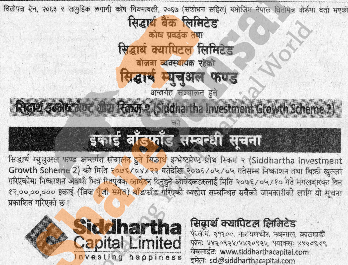 Siddhartha Capital Limited has allotted its 120 million units of Rs 10 face value each mutual fund scheme worth Rs 1.20 billion (Siddhartha Investment Growth Scheme-2) to the general public on 10th Bhadra, 2076.