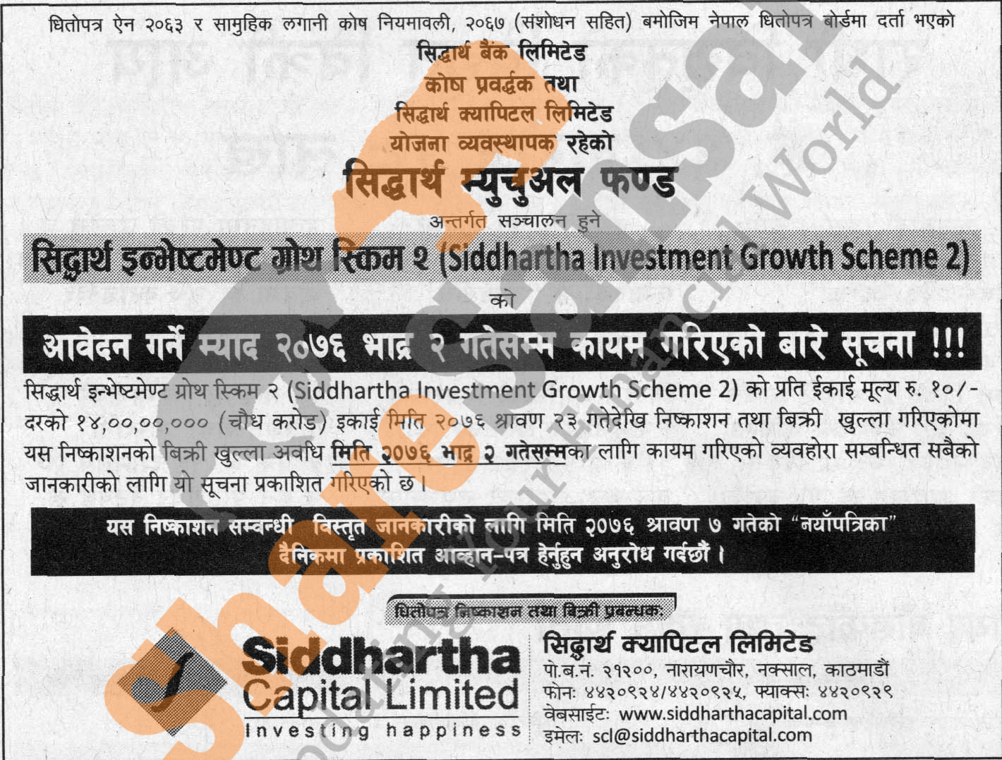 Siddhartha Capital Limited has extended its 140 million units of Rs 10 face value each mutual fund scheme worth Rs 1.40 billion (Siddhartha Investment Growth Scheme-2 ) to the general public till (2nd Bhadra, 2076).