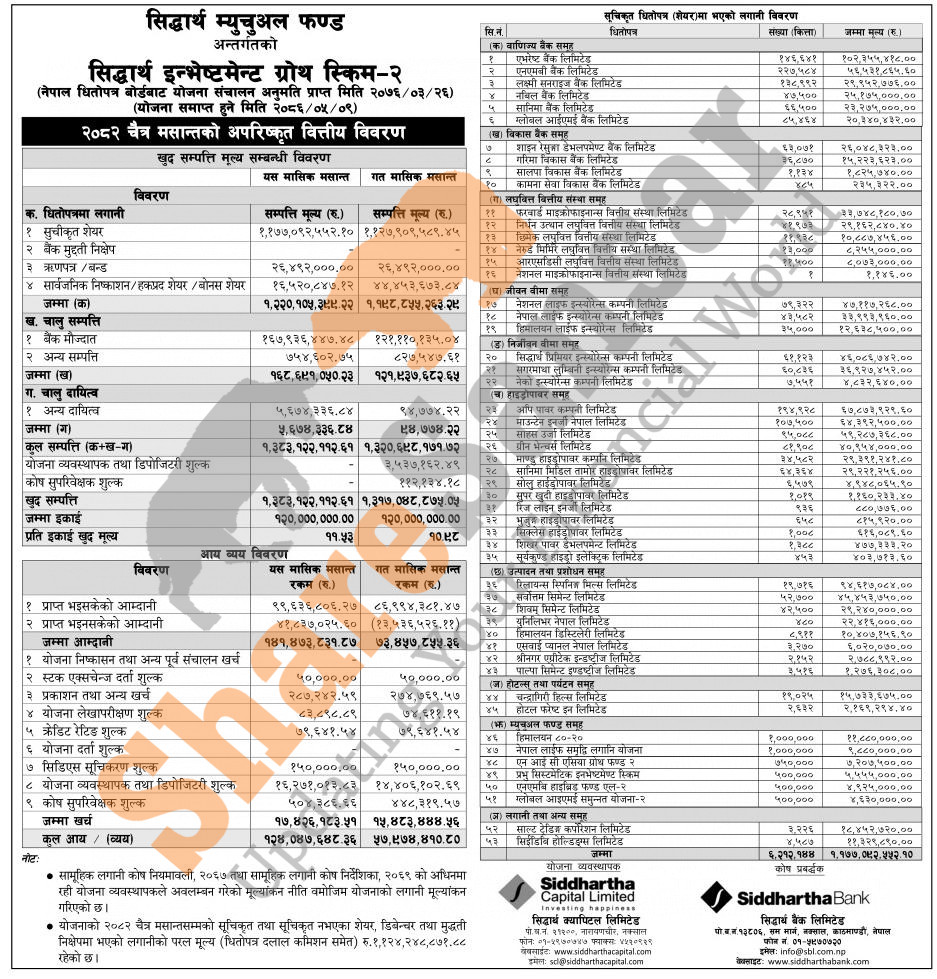 Siddhartha Capital Limited has published “Siddhartha Investment Growth Scheme - 2” Net Asset Value (NAV) till Chaitra, 2082.