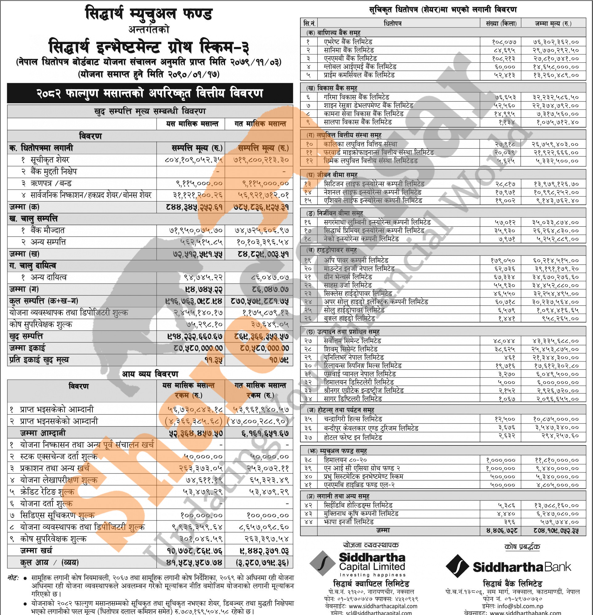 Siddhartha Capital Limited has published “Siddhartha Investment Growth Scheme - 3” Net Asset Value (NAV) till Falgun, 2082.