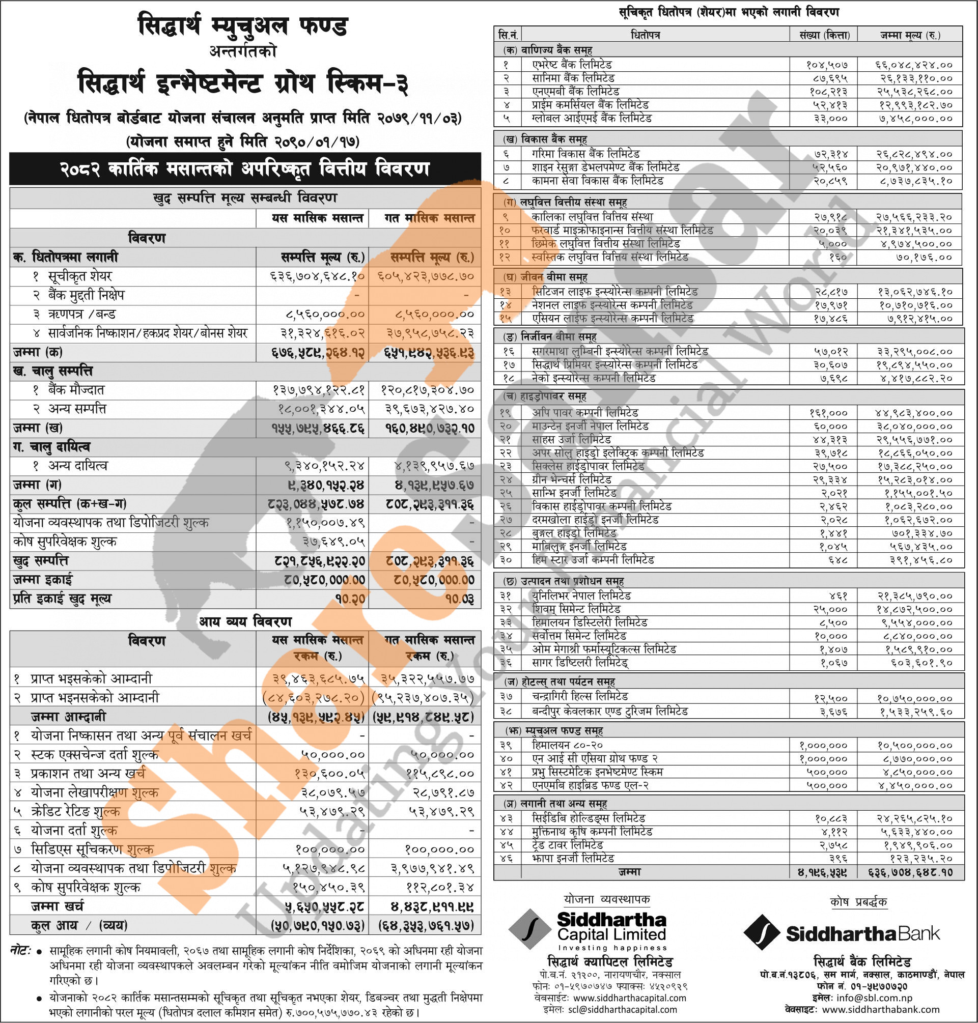 Siddhartha Capital Limited has published “Siddhartha Investment Growth Scheme - 3” Net Asset Value (NAV) till Kartik, 2082.