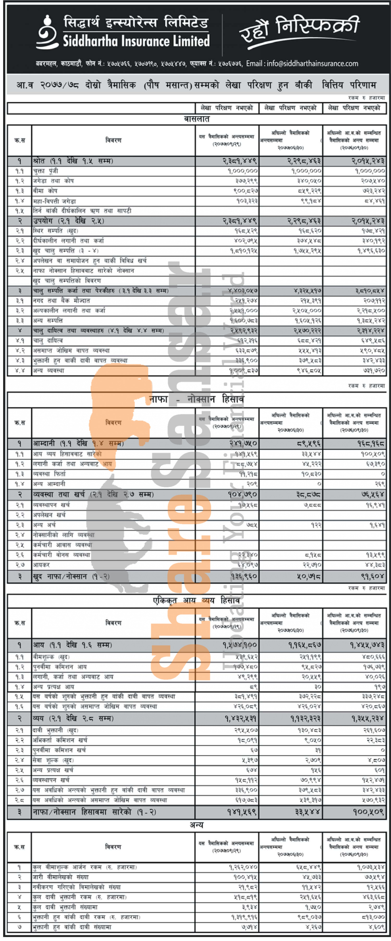 Siddhartha Insurance Limited has posted a net profit of Rs 136.96 million and published its 2nd quarter company analysis of the fiscal year 2077/78.