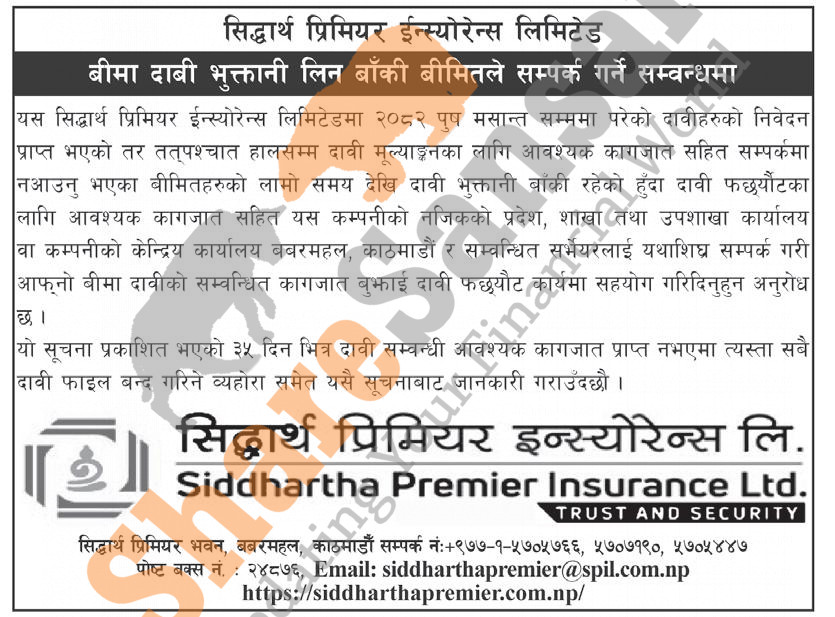Siddhartha Premier Insurance Limited has published a notice to the insured requesting the submission of necessary documents.