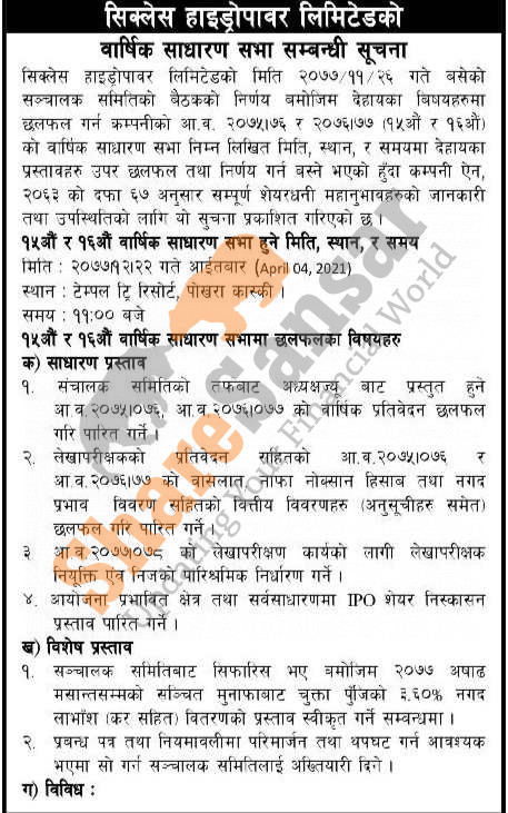 Sikles Hydropower Limited has announced its 14th and 15th AGM going to be held on 22nd Chaitra, 2077.