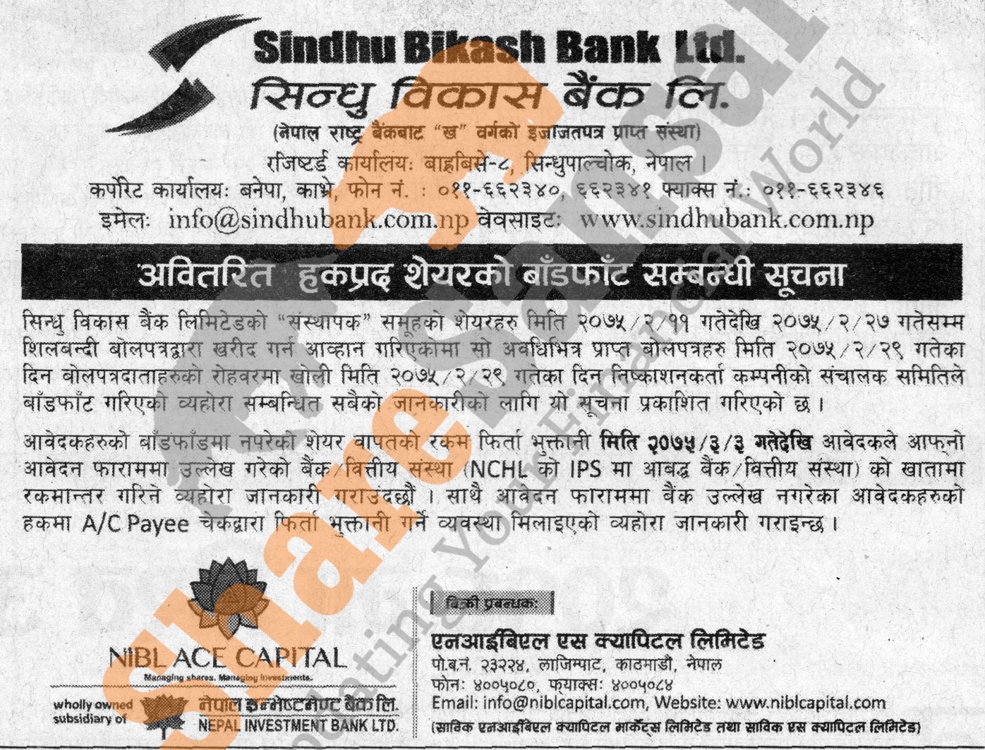 Sindhu Bikas Bank Limited has allotted its 5,35,301.40 units promoter share in auction to the general public on 29th Jestha, 2075 and refunding money to non-allottee investors from 3rd Ashad, 2075.