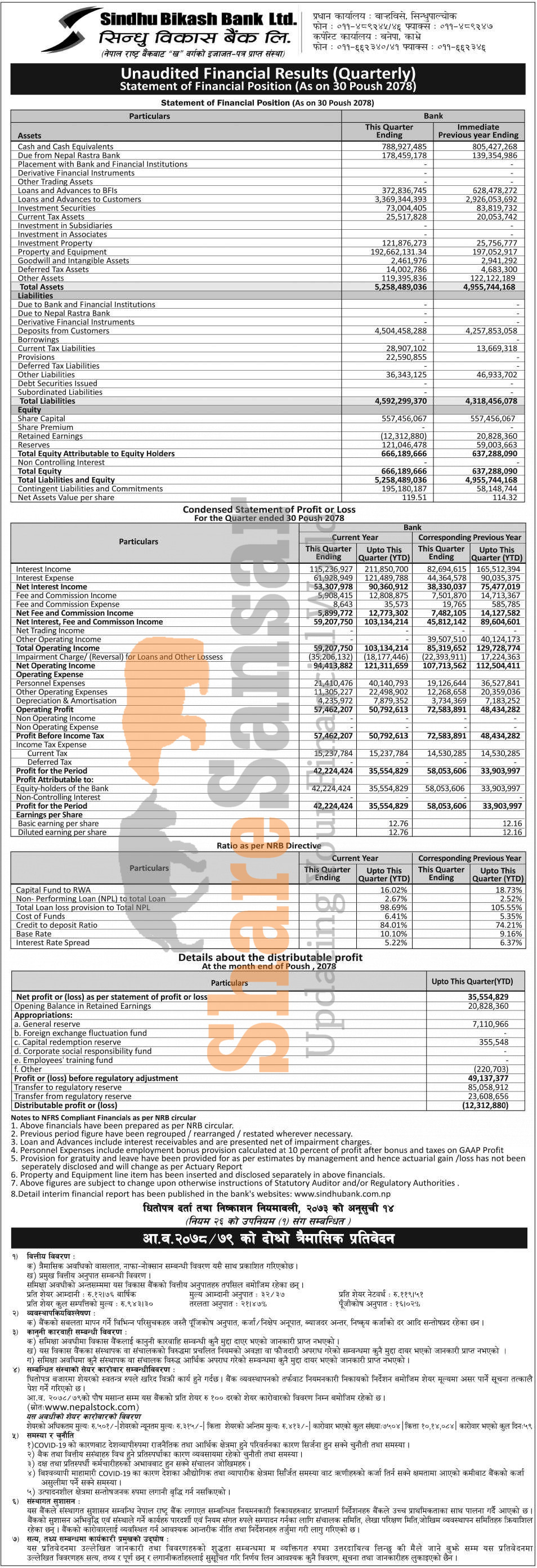 Sindhu Bikas Bank Limited has posted a net profit of Rs 35.55 million and published its 2nd quarter company analysis of the fiscal year 2078/79.