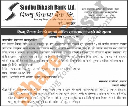 Sindhu Bikas Bank Limited  has postponed its 16th AGM date to 29th Falgun, 2082.