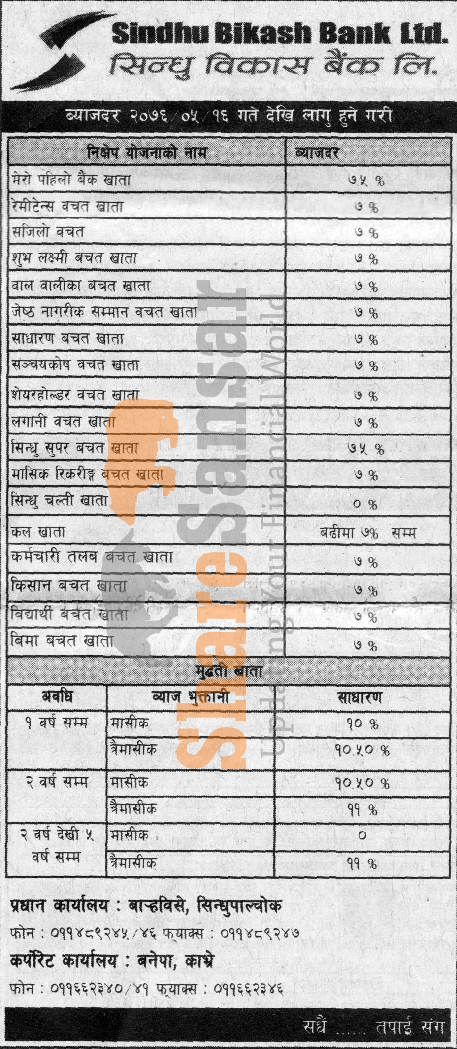 Sindhu Bikas Bank Limited has published a notice regarding new interest rate and its effective from 16th Bhadra, 2076.