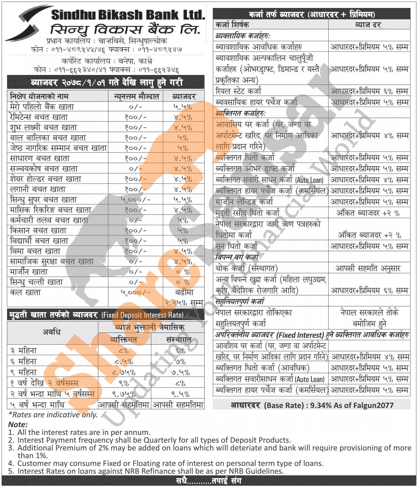 Sindhu Bikas Bank Limited has published a notice regarding the new interest rate for deposit and loan products and it's effective from 1st Baisakh, 2078.