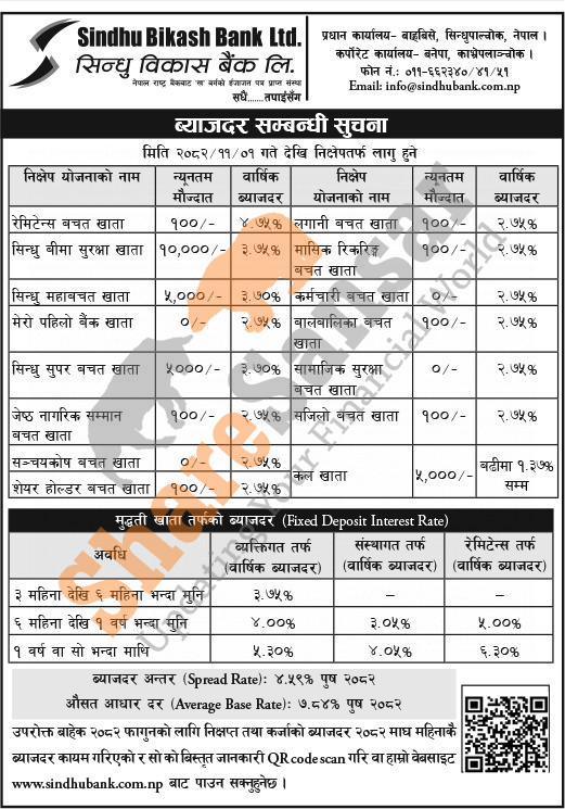 Sindhu Bikas Bank Limited has published a notice regarding the new interest rate for deposit and loan products and it's effective from 1st Falgun, 2082.