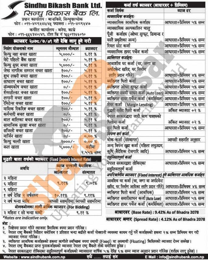 Sindhu Bikas Bank Limited has published a notice regarding the new interest rate for deposit and loan products and it's effective from 1st Kartik, 2078.