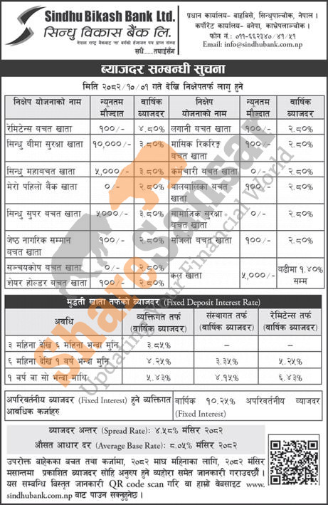 Sindhu Bikas Bank Limited has published a notice regarding the new interest rate for deposit and loan products and it's effective from 1st Magh, 2082.