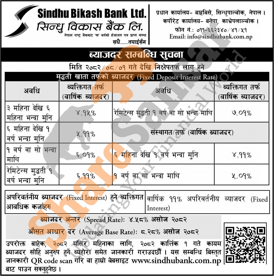 Sindhu Bikas Bank Limited has published a notice regarding the new interest rate for deposit and loan products and it's effective from 1st Mangsir, 2082.