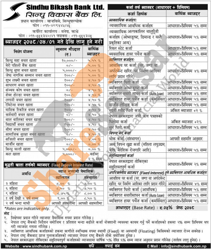 Sindhu Bikas Bank Limited has published a notice regarding the new interest rate for deposit and loan products and it's effective from 1st Shrawan, 2078.