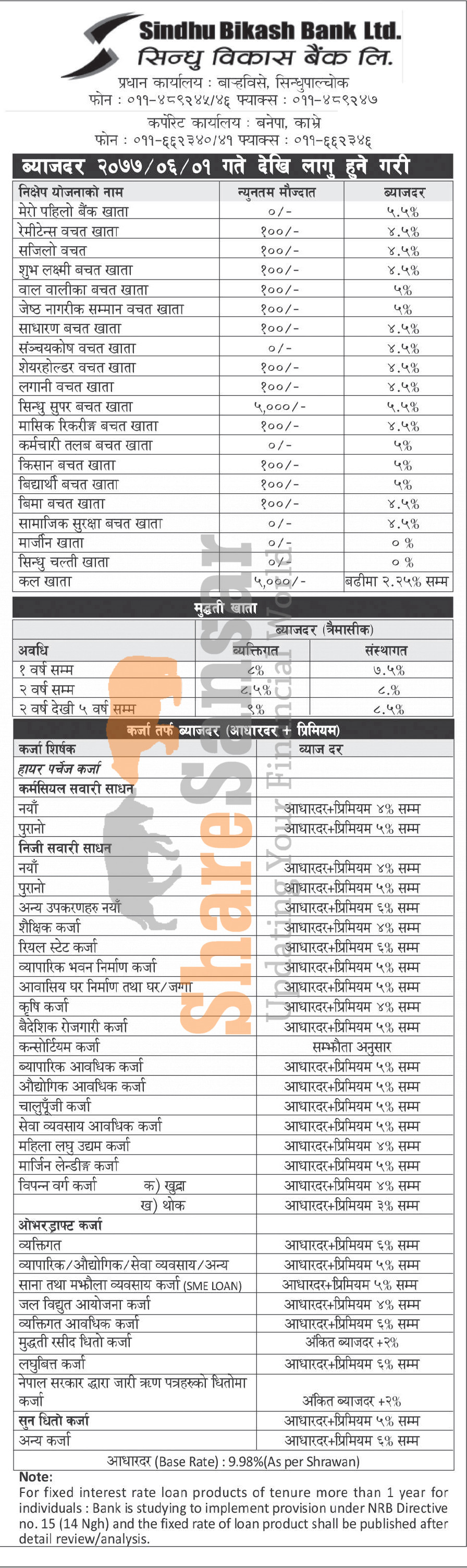 Sindhu Bikas Bank Limited has published a notice regarding the new interest rate for its deposit and loan product and its effective from 1st Ashwin, 2077.