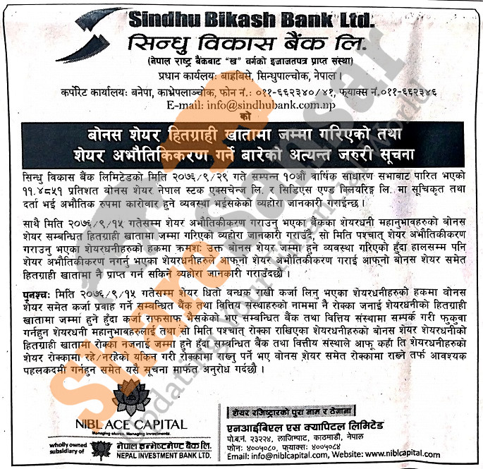 Sindhu Bikas Bank Limited is distributing 11.4851% bonus shares directly to DEMAT accounts of its shareholders and has urged to dematerialize their shares.