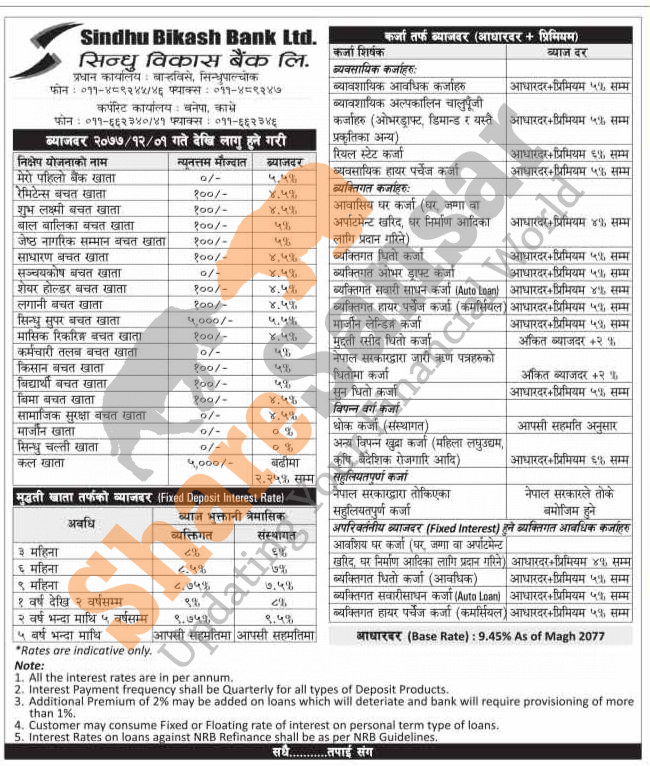Sindhu Bikash Bank Limited has published a notice regarding the new interest rate for deposit and loan products and it's effective from 1st Chaitra, 2077.