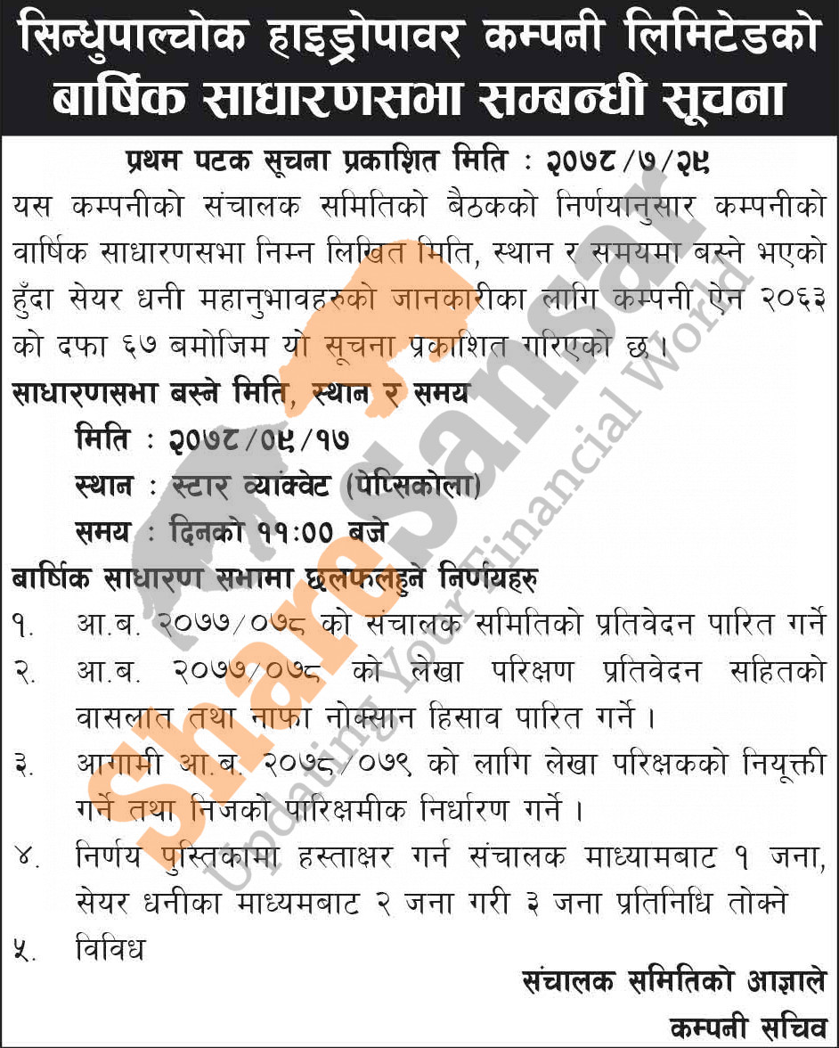 Sindhupalchowk Hydropower Company Limited has announced its Annual General Meeting going to be held on 17th Poush, 2078.