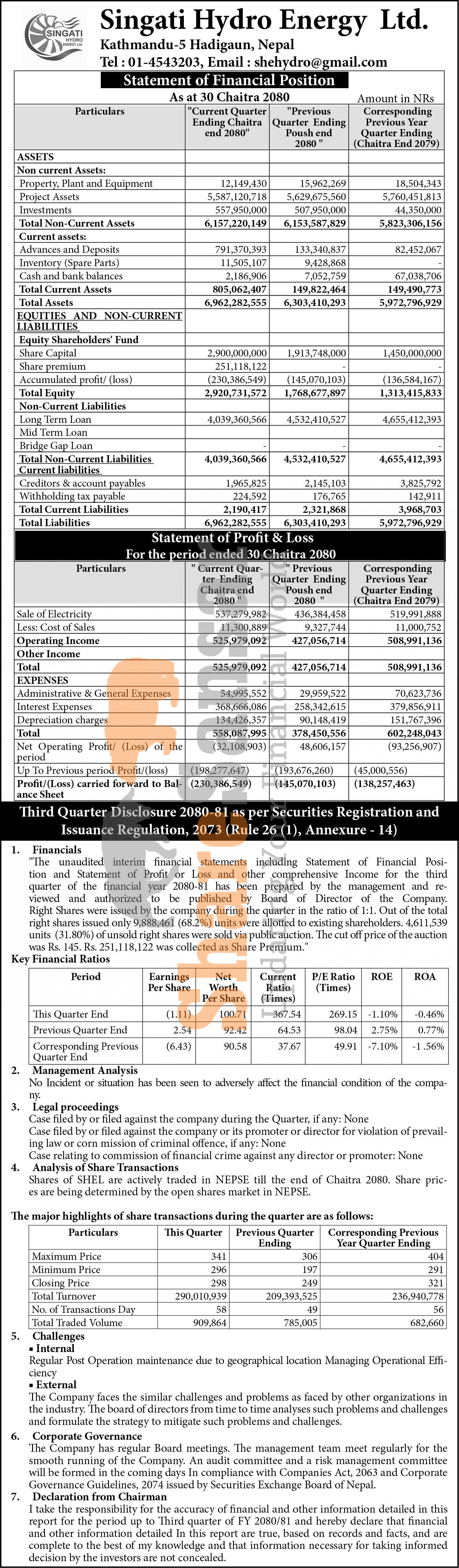Singati Hydro Energy Limited has posted a net loss of Rs 32.10 million and published its 3rd quarter company analysis of the fiscal year 2080/81.