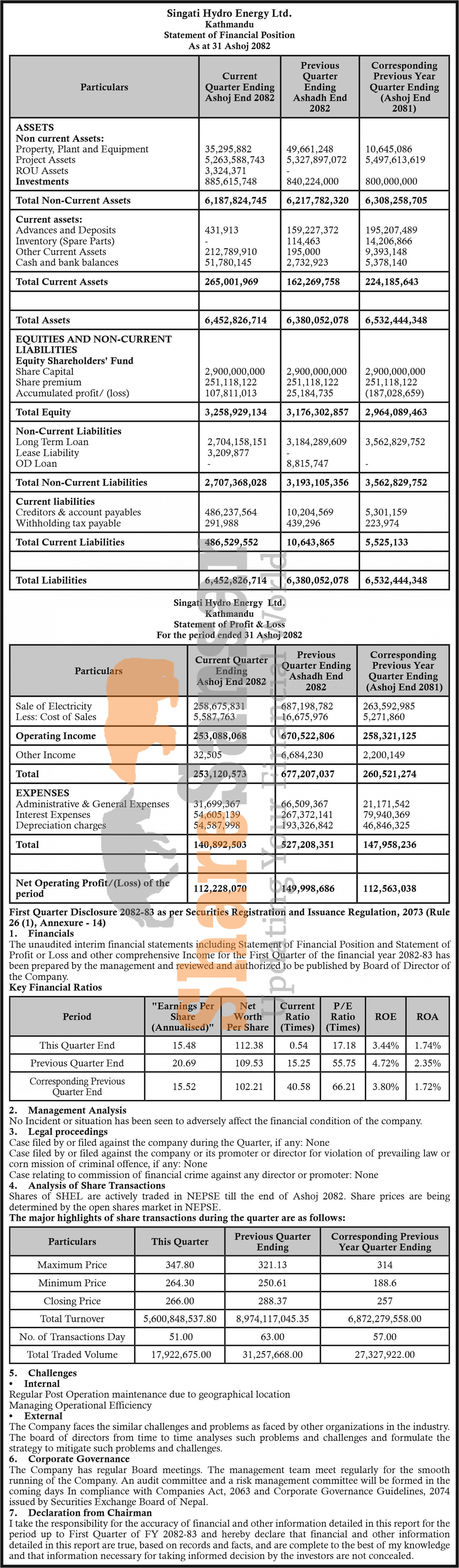 Singati Hydro Energy Limited has posted a net profit of Rs 112.22 million and published its 1st quarter company analysis of the fiscal year 2082/83.