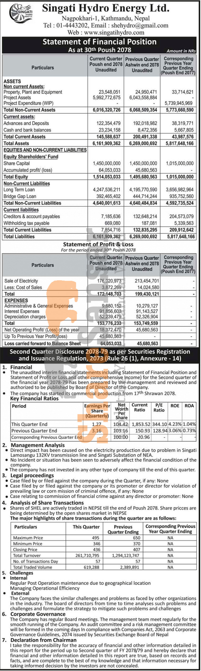 Singati Hydro Energy Limited has posted a net profit of Rs 18.37 million and published its 2nd quarter company analysis of the fiscal year 2078/79.