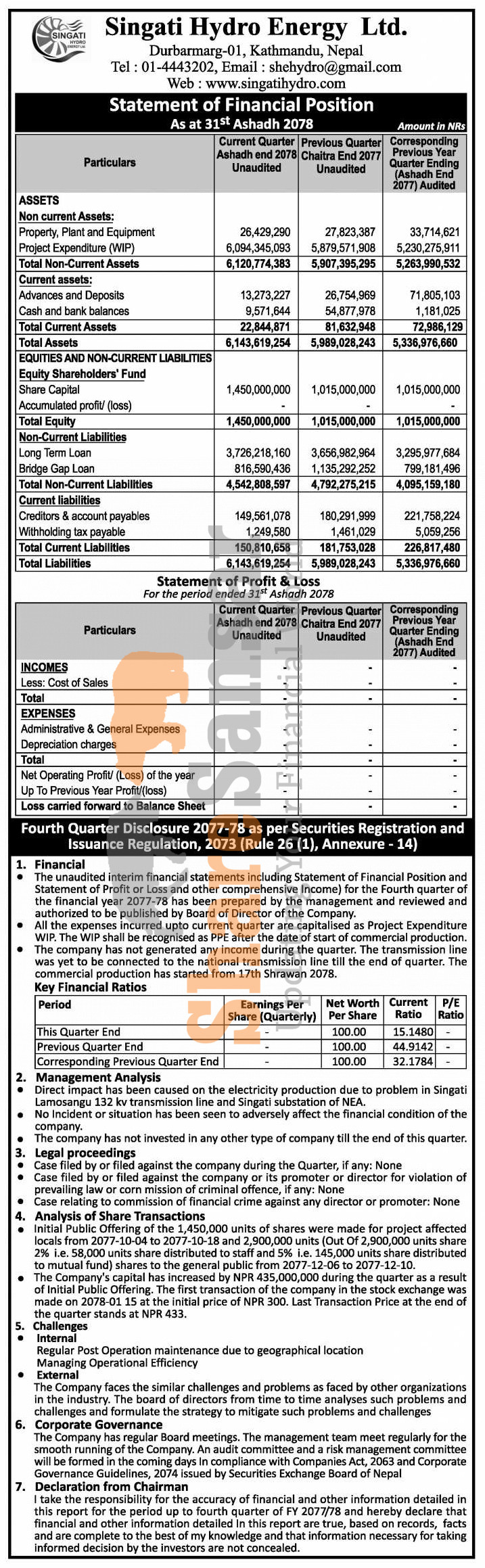 Singati Hydro Energy Limited has published its 4th quarter report of the fiscal year 2077/78.