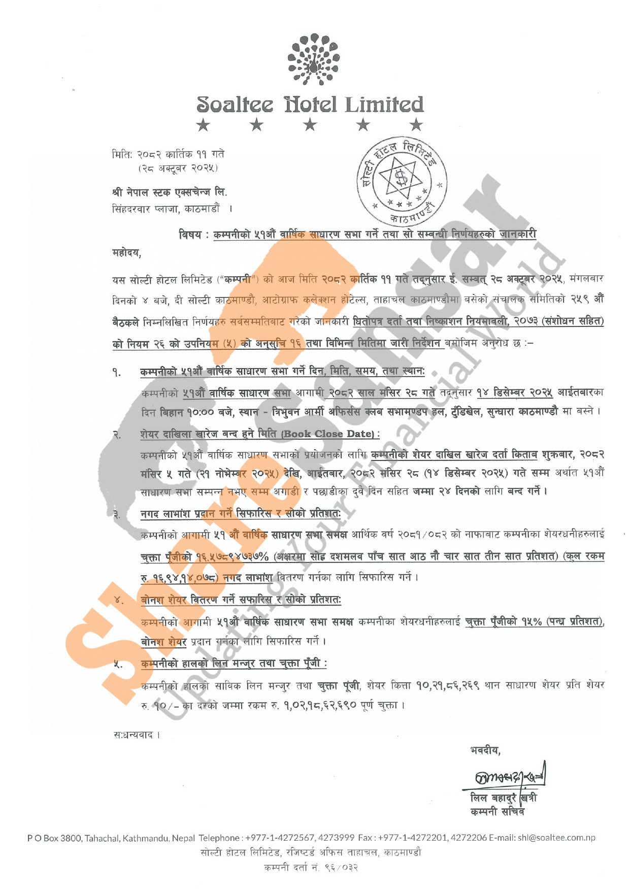 Soaltee Hotel Limited has announced its 51st AGM going to be held on 28th Mangsir, 2082.