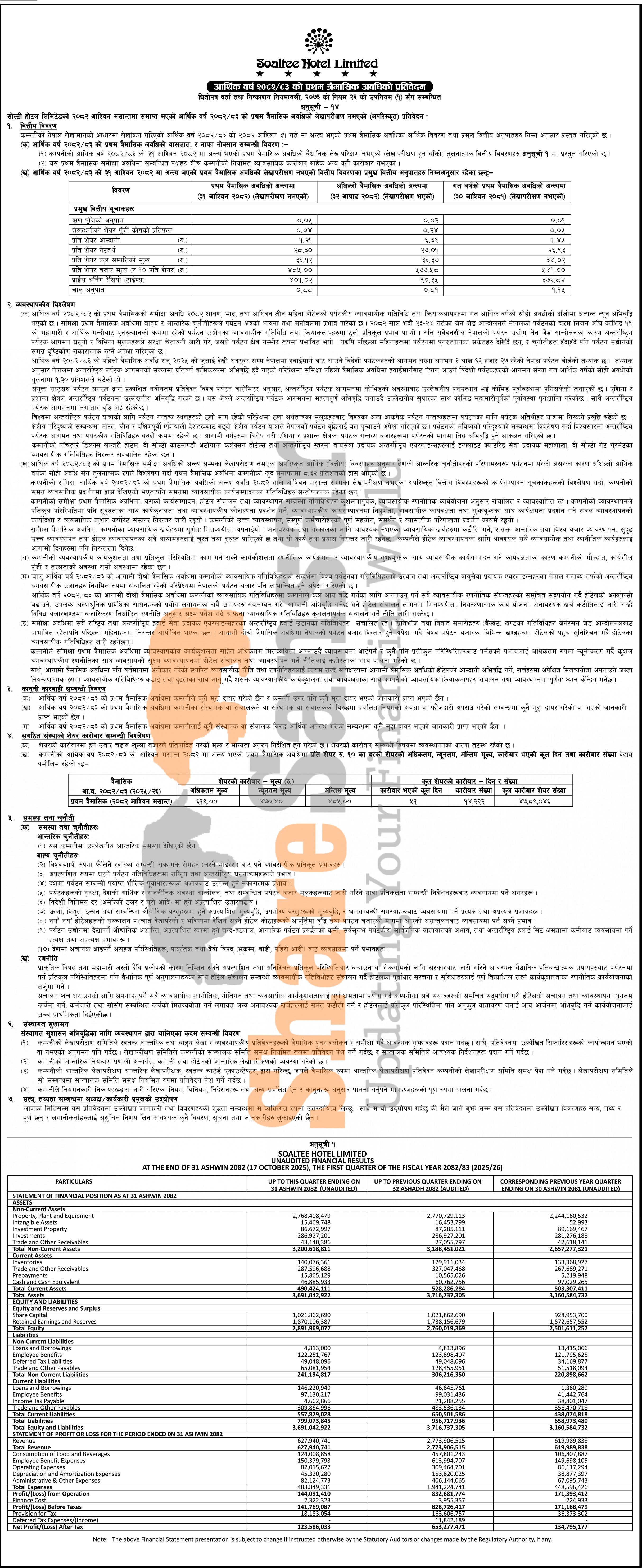 Soaltee Hotel Limited has posted a net profit of Rs 123.58 million and published its 1st quarter company analysis of the fiscal year 2082/83.